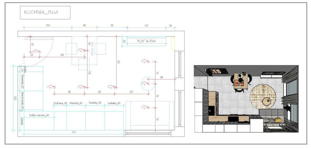 Poniżej przykładowy rzut kuchni jednego z moich klientów w wersji 3D i 2D .