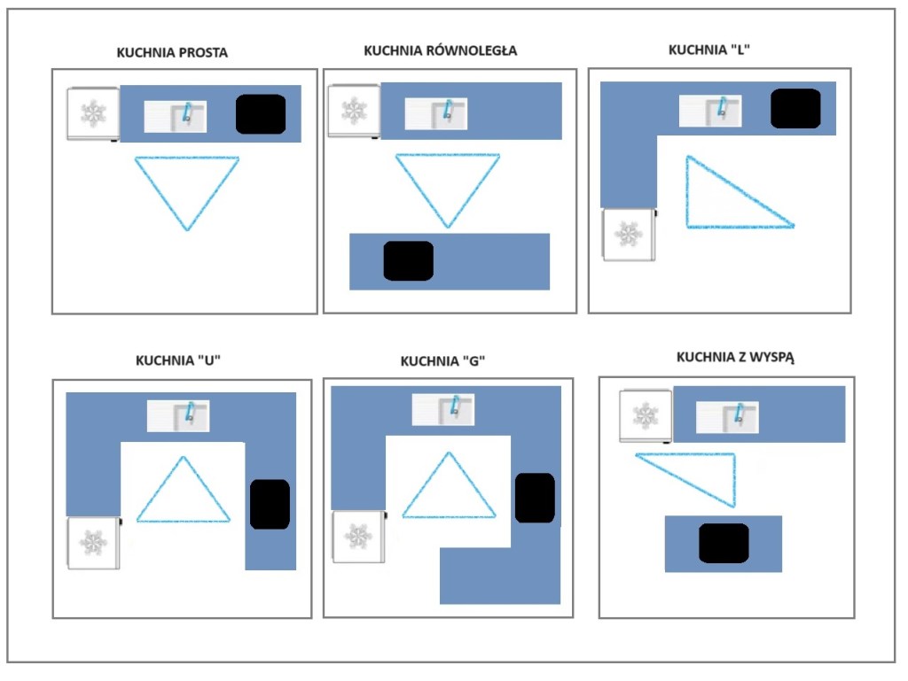 Projektując kuchnię trzeba zachować tak zwany ciąg technologiczny – zwany inaczej ciągiem roboczym. Robimy to w celu usprawnienia sobie pracy w kuchni, po to by zminimalizować ilość kroków, a także zachowania w niej bezpieczeństwa pracy.