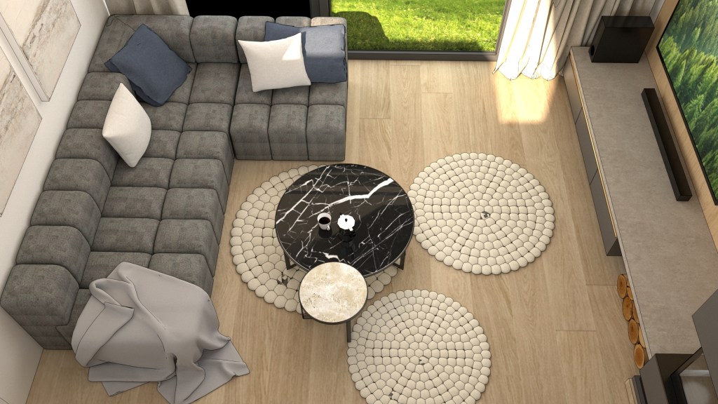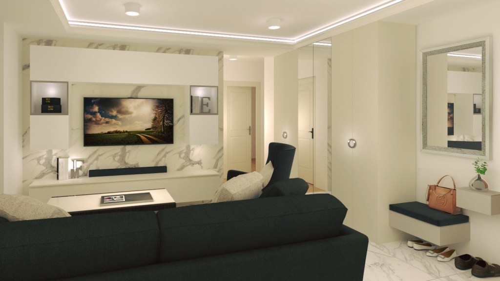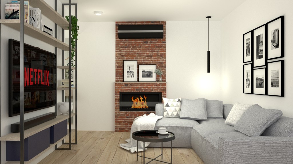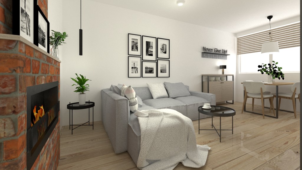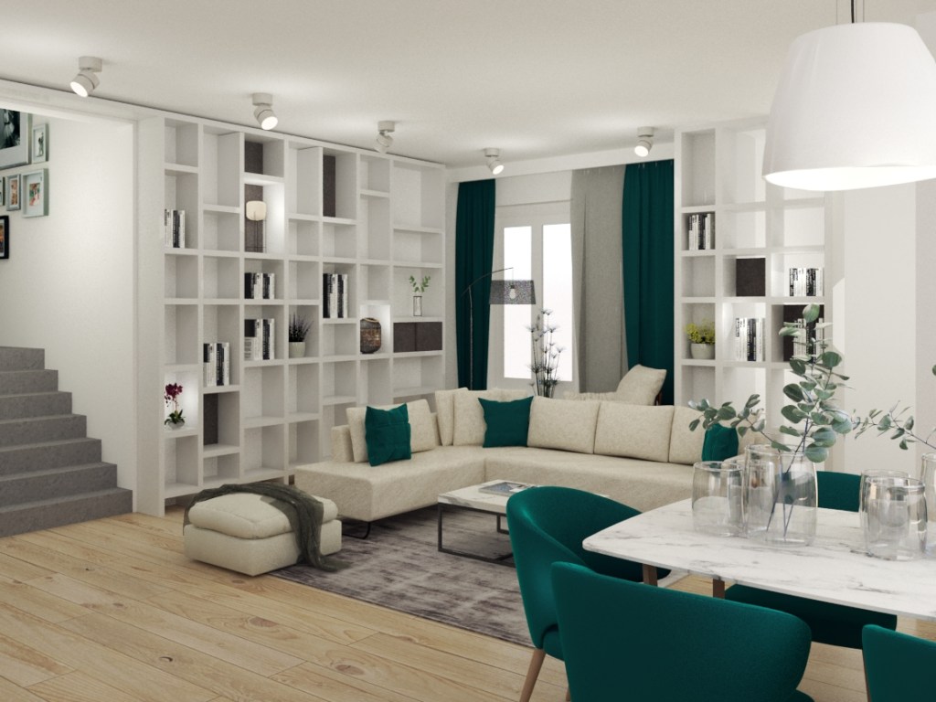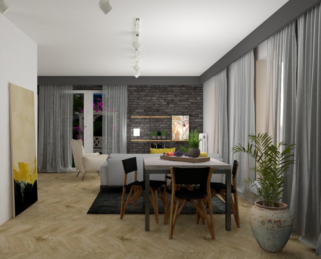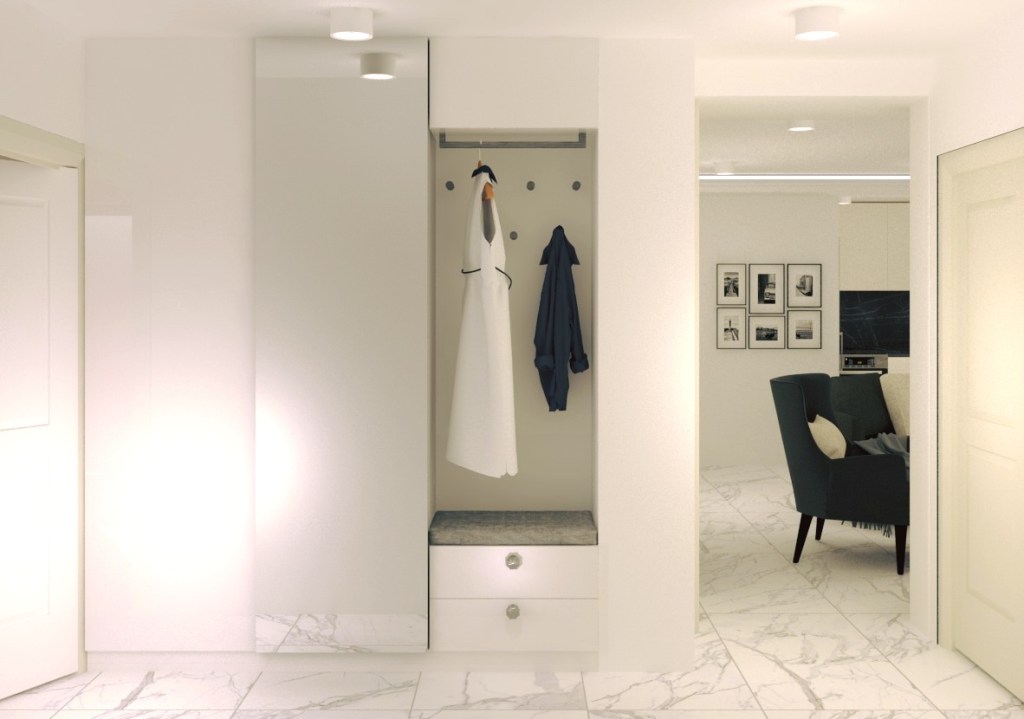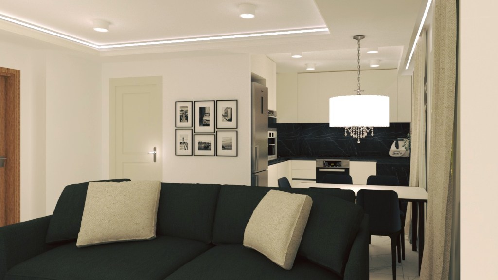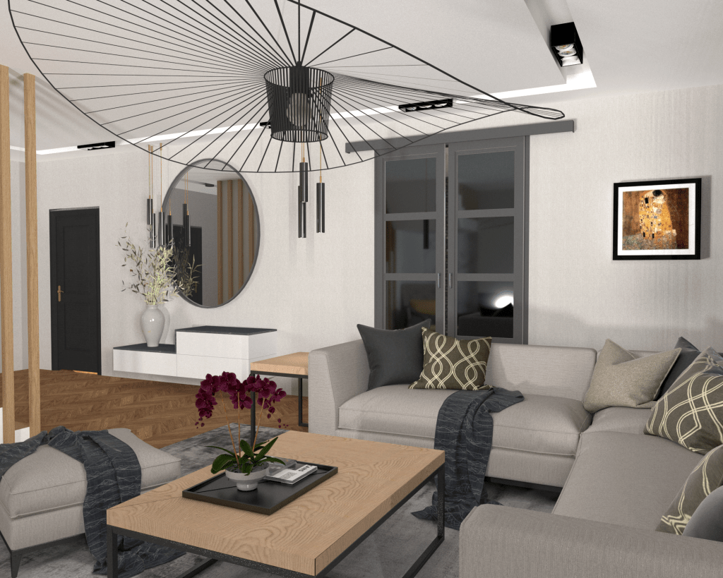 Projekt nowoczesnego wnętrza z adaptacją sporej ilości mebli posiadanych przez Inwestora. Postawiliśmy na kontrastowe rozwiązanie bieli, szarości i grafitów z kilkoma akcentami ochry pojawiającymi się w obrazie czy poduszkach na kanapie. Całość wnętrza prezentuje się jako spokojna, bezpieczna i zrównoważona przestrzeń.