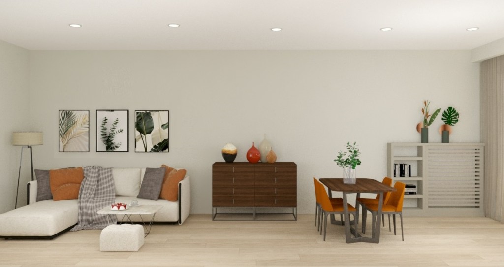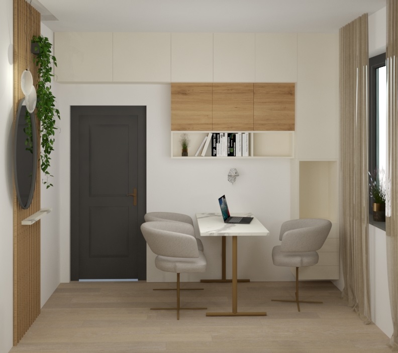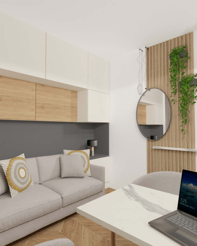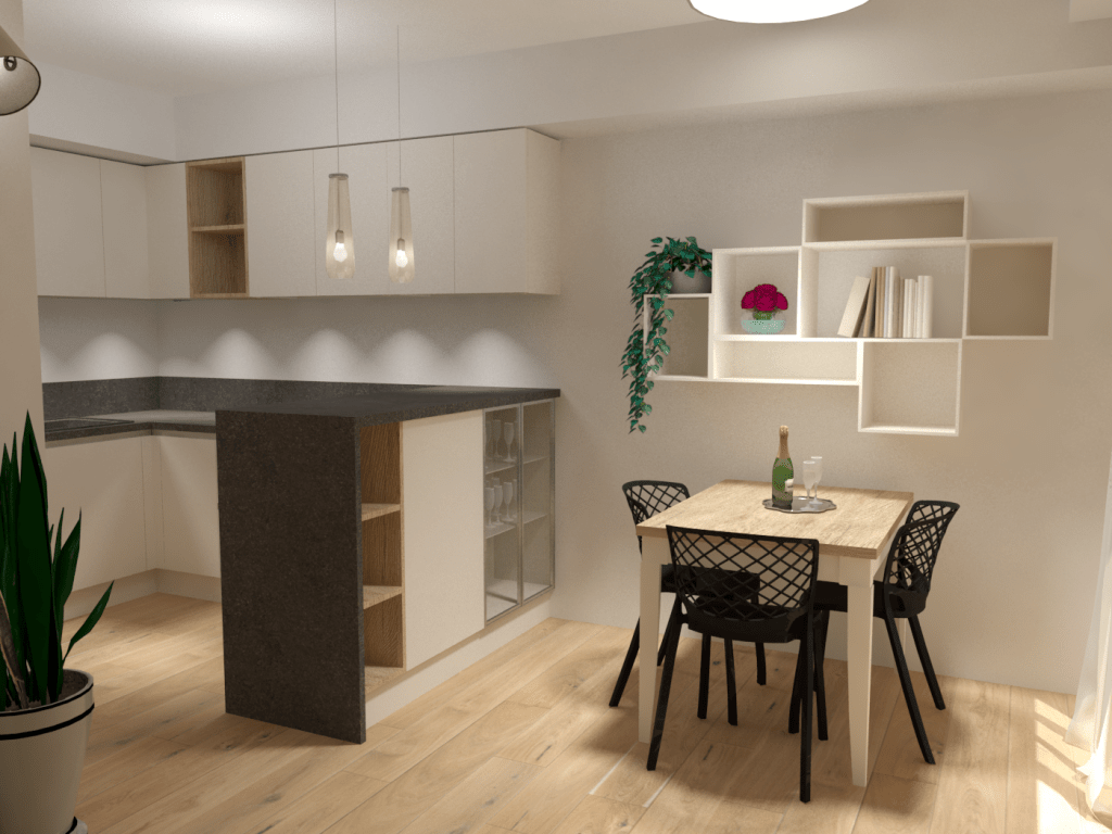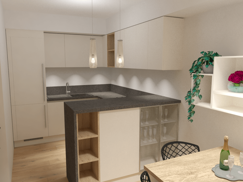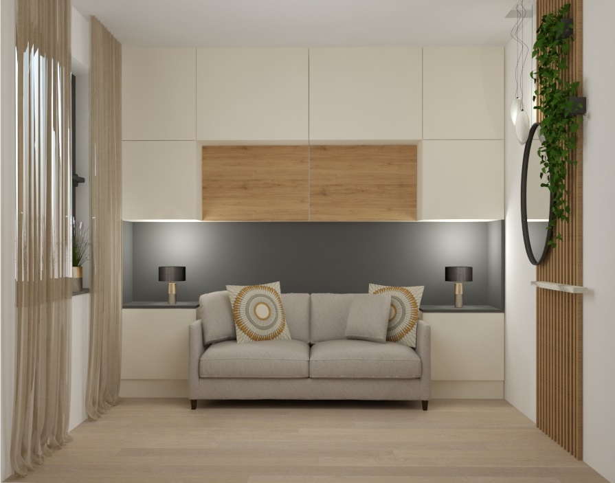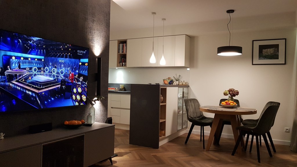Projekt wnętrz obejmował kuchnię z jadalnią, salon oraz sypialnię. Niewielka kuchnia została stworzona z myślą o wygodzie i dużej ilości miejsca na przechowywanie, a tuż obok okna balkonowego znalazło się miejsce na uroczy okrągły stół z krzesłami. Projekt wnętrz wykonany dla ciepłych i rodzinnych ludzi, którzy z sentymentem patrzą na swoje pamiątki z przeszłości i z radością w oczach spoglądają w przyszłość.