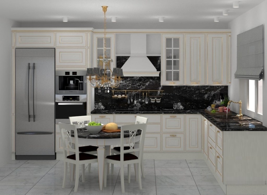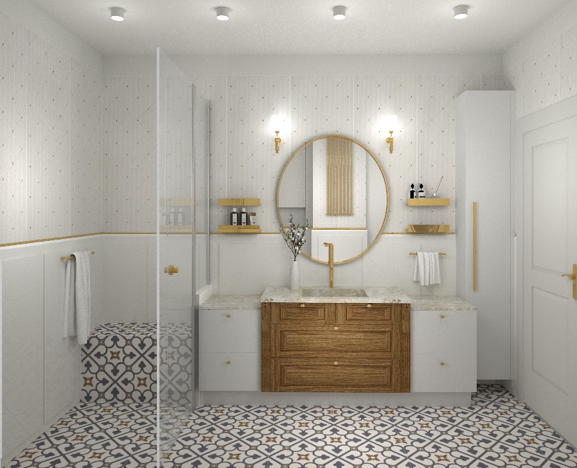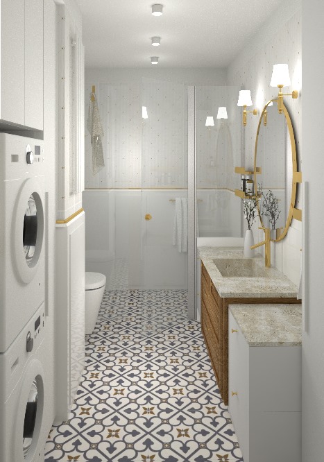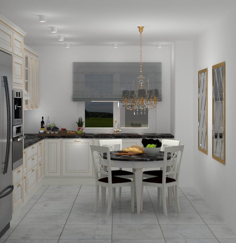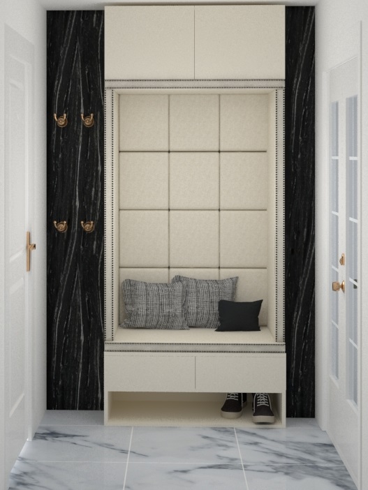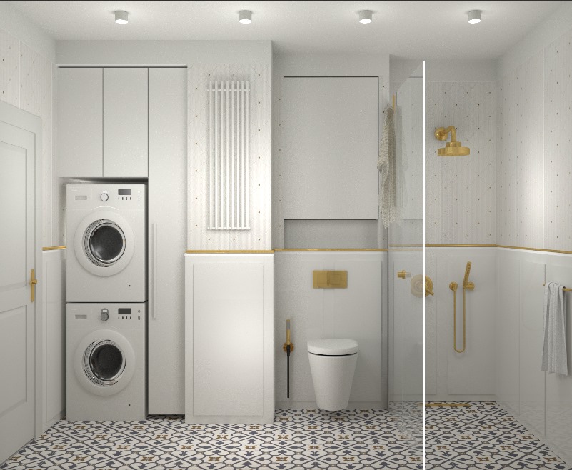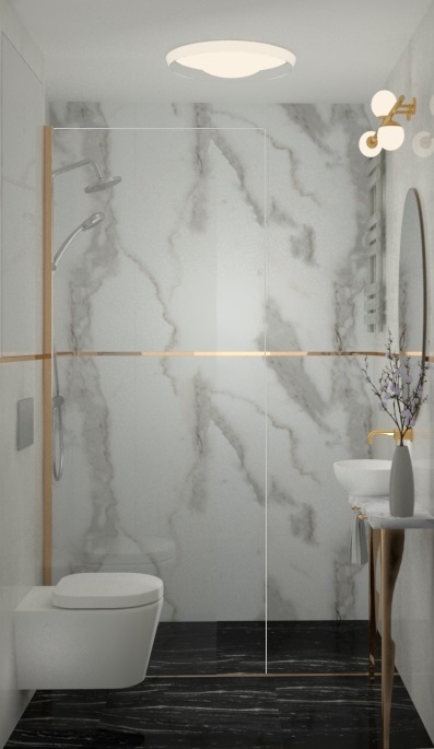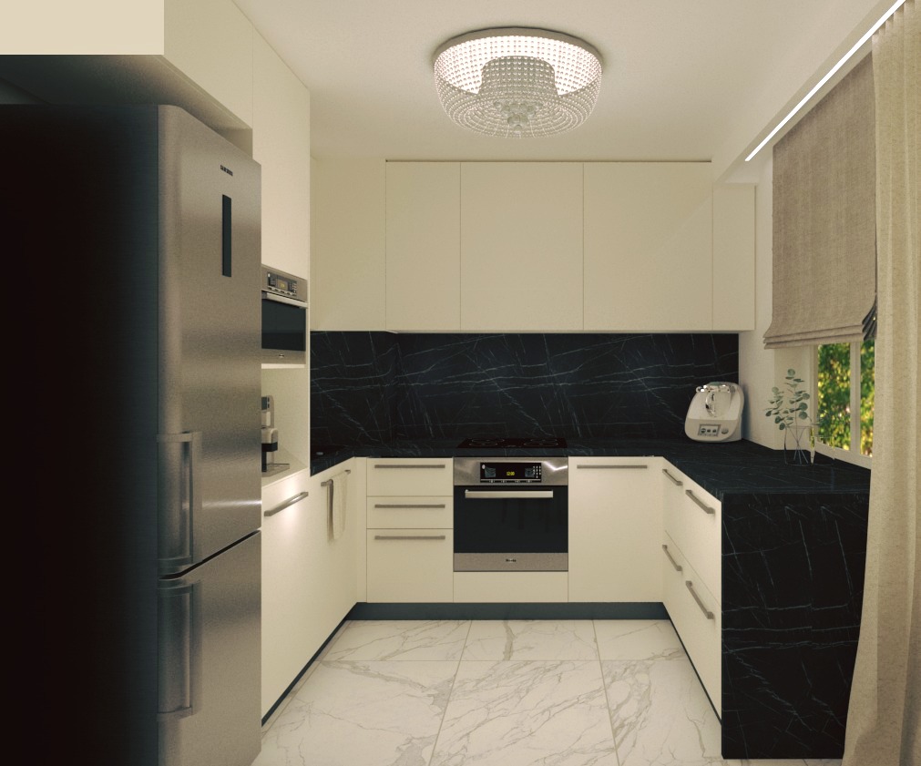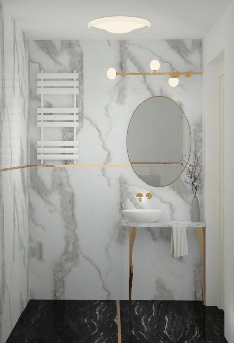 Projekt wnętrz w Ligocie obejmował małą łazienkę z kabiną prysznicową, sporą kuchnię w stylu glamour oraz niewielki wiatrołap. Biel, czerń i złoto odegrały główną rolę w temacie kolorystyki, a kuchnia została wykonana w klasycznym rzeźbionym froncie ze złotą ramką.
