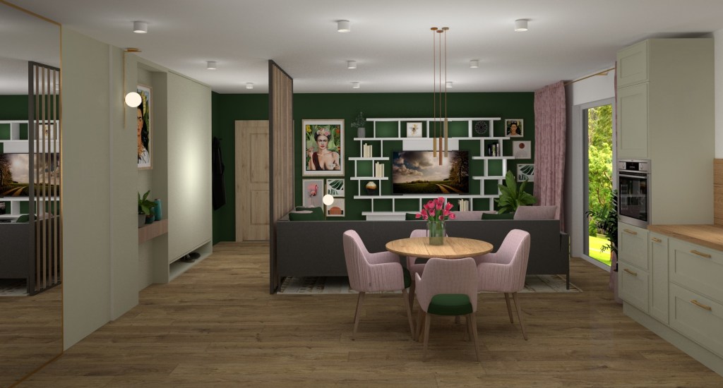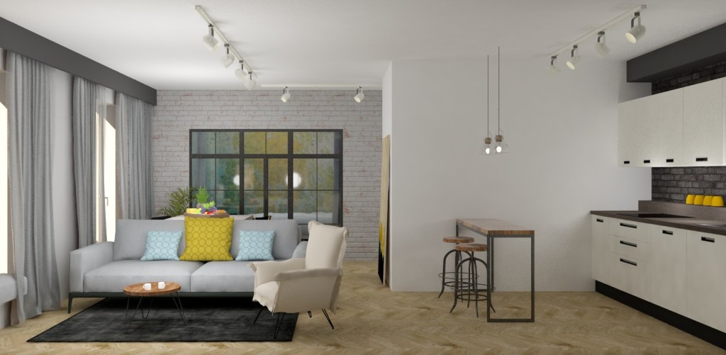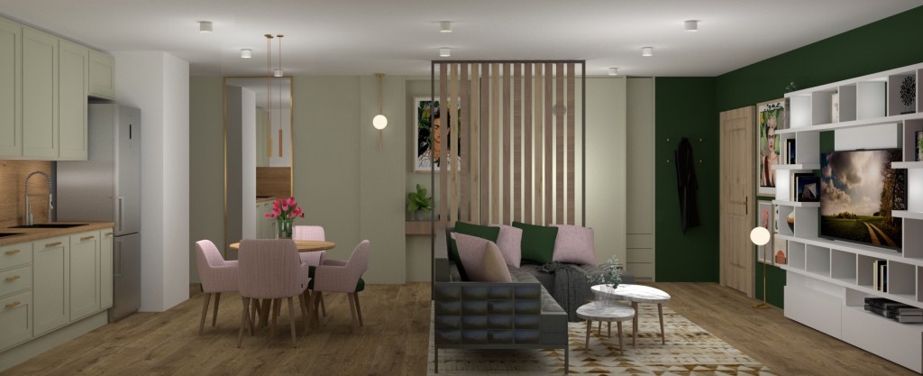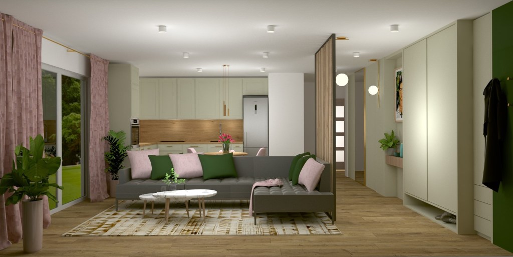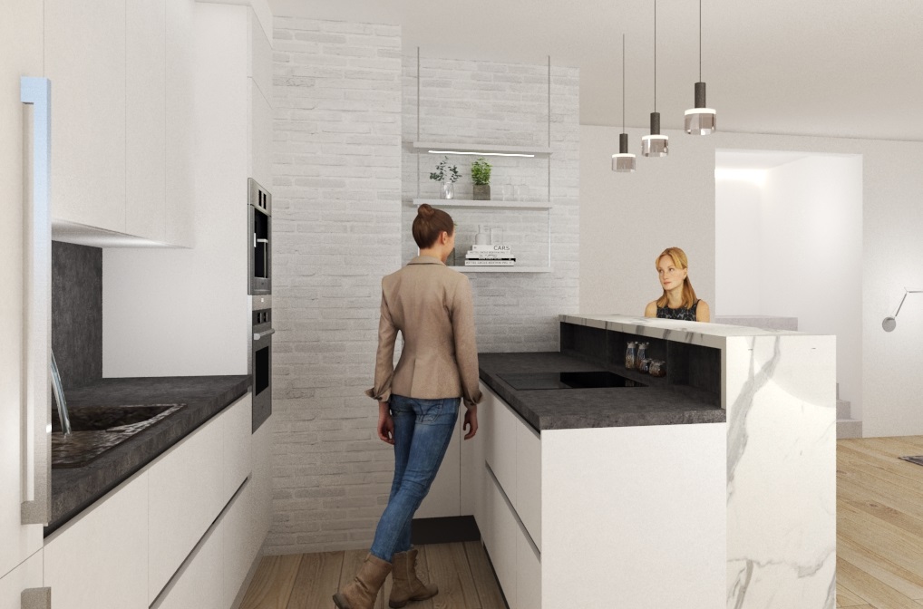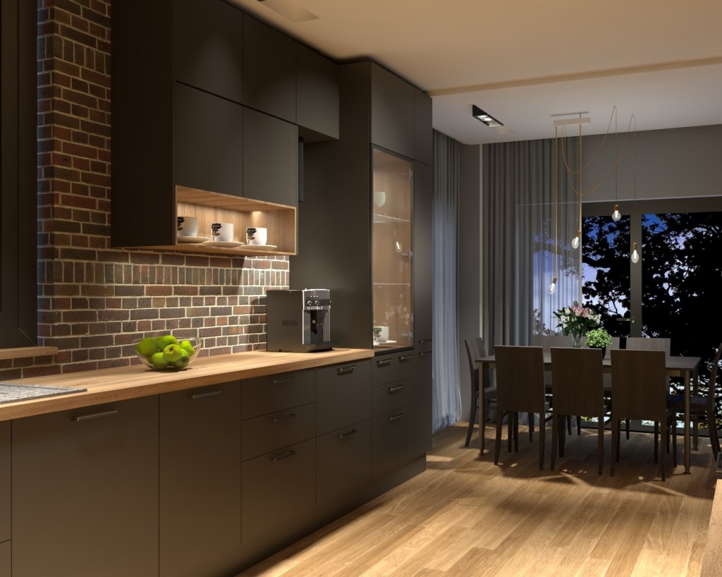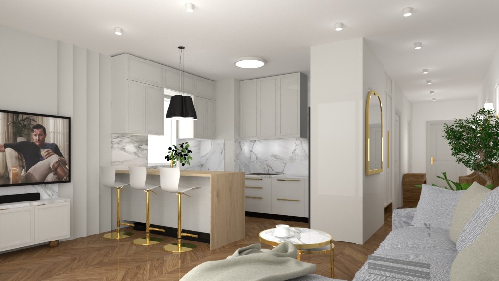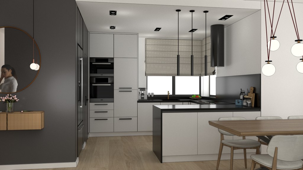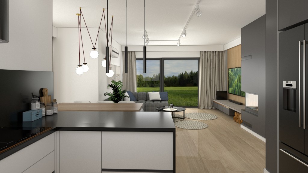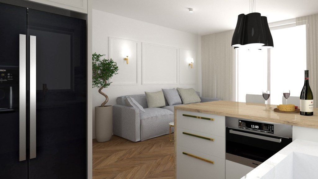 Projekt kuchni połączonej z salonem i hallem. Pierwotnie wszystkie pomieszczenia były oddzielone ścianami działowymi, tworząc wąską kuchnię i długi wąski korytarz, usunęliśmy je tworząc powierzchnię openspace.