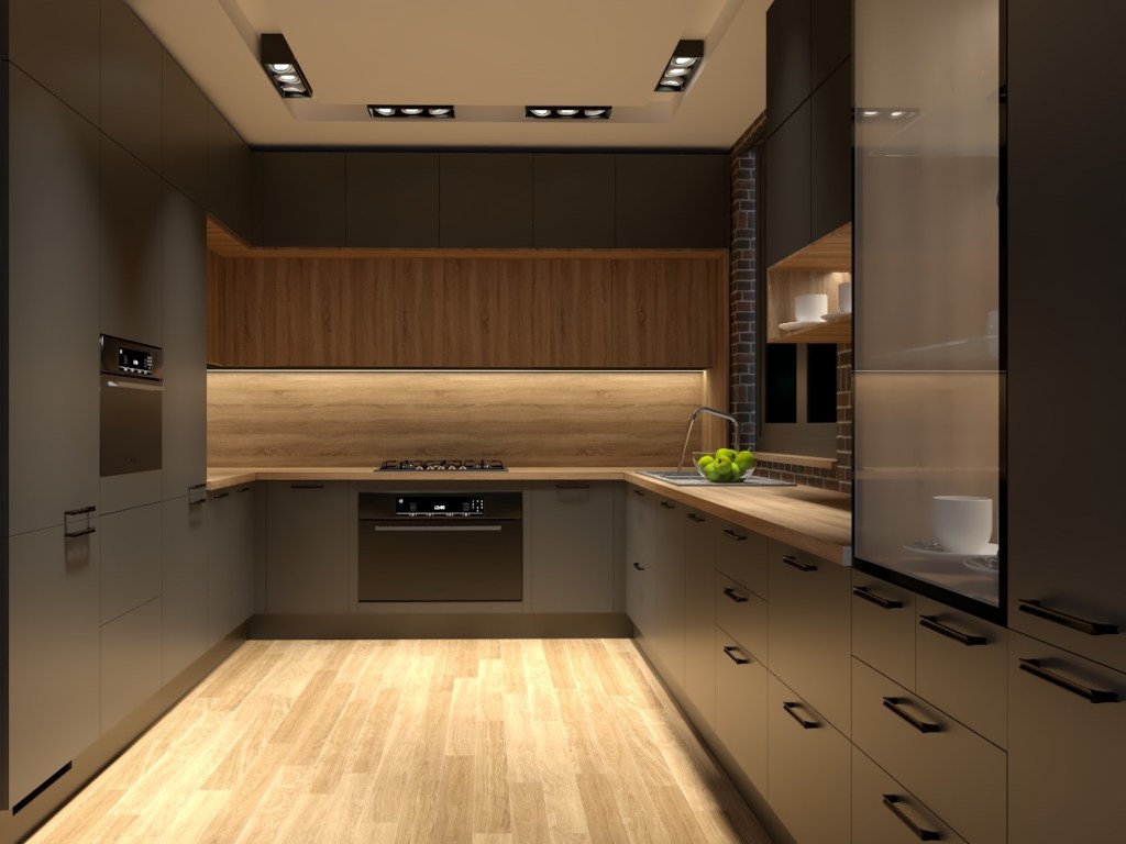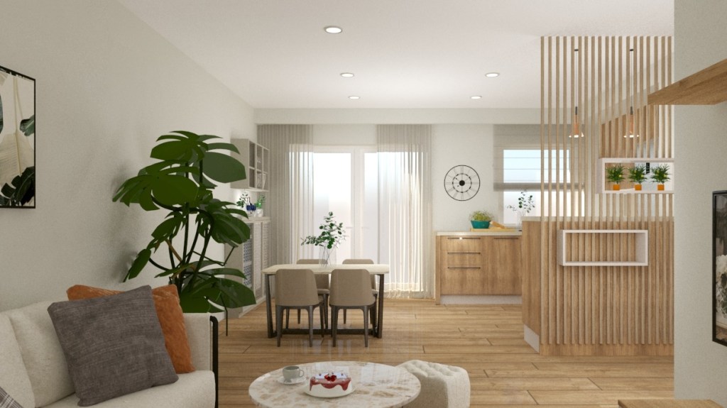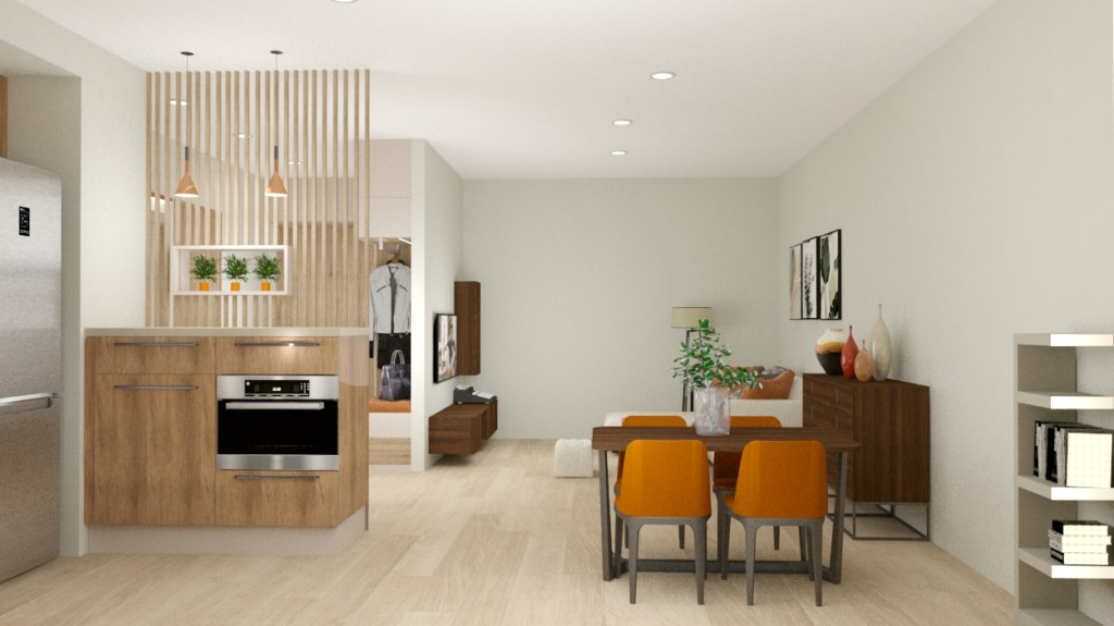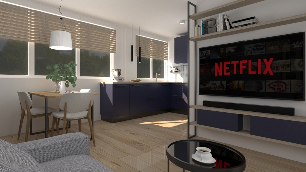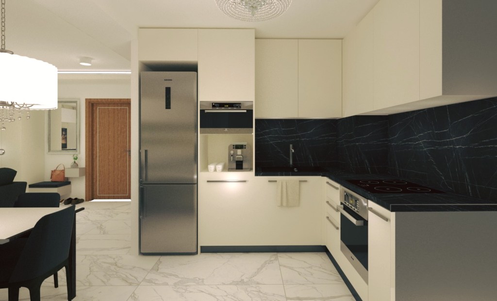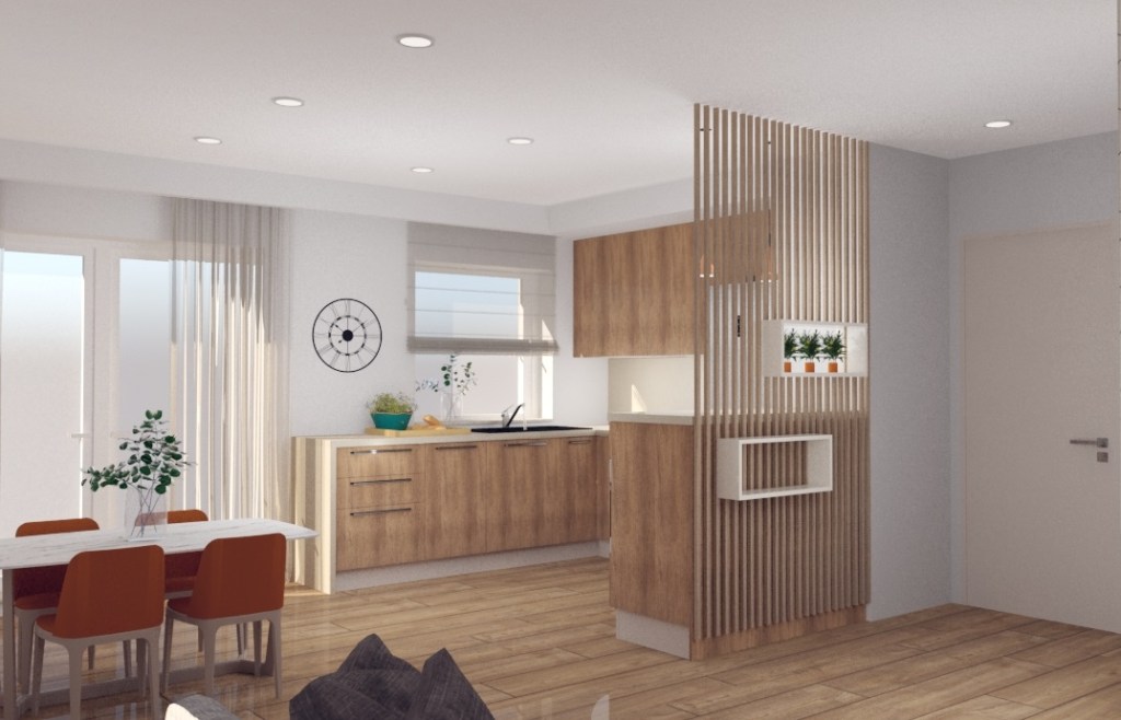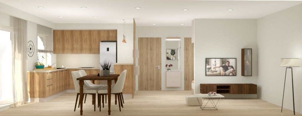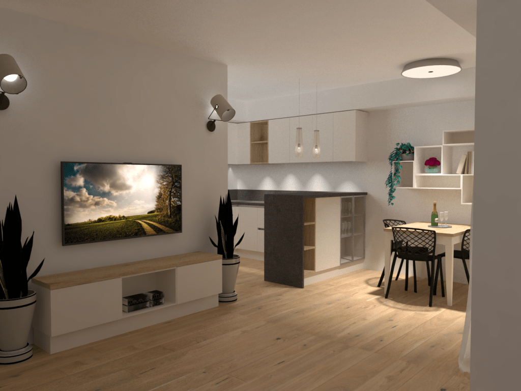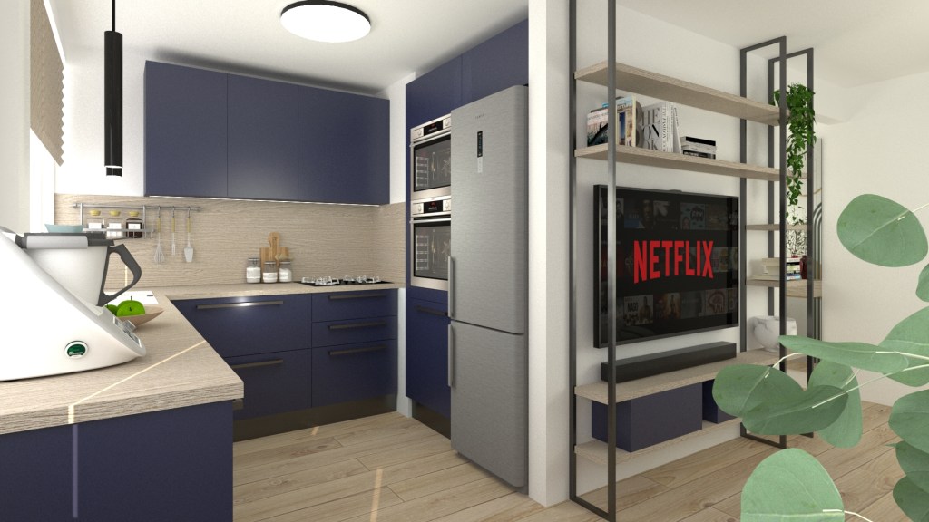 Projekt kuchni połączonej z salonem i hallem. Pierwotnie wszystkie pomieszczenia były oddzielone ścianami działowymi, tworząc wąską kuchnię i długi wąski korytarz, usunęliśmy je tworząc powierzchnię openspace.