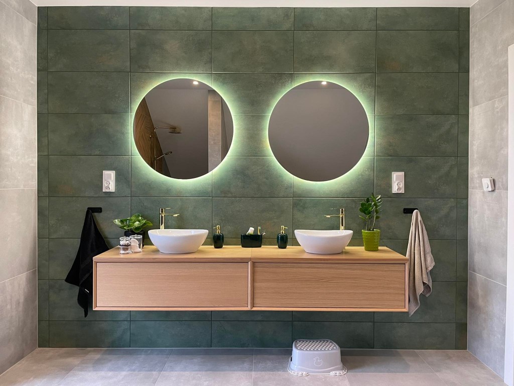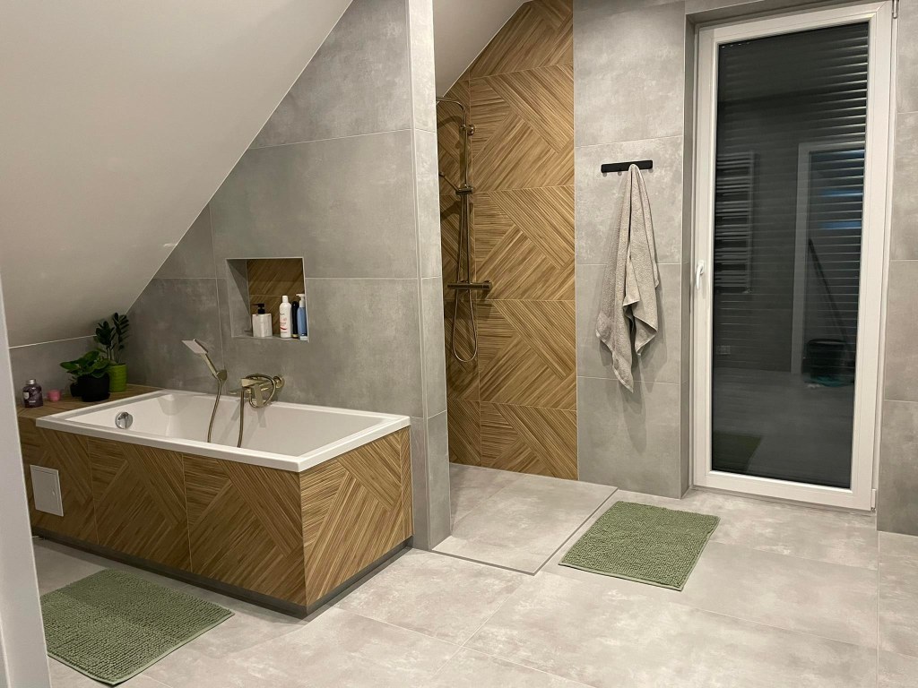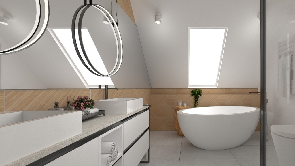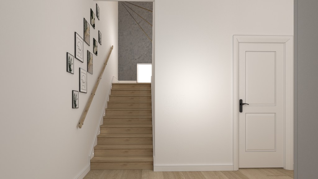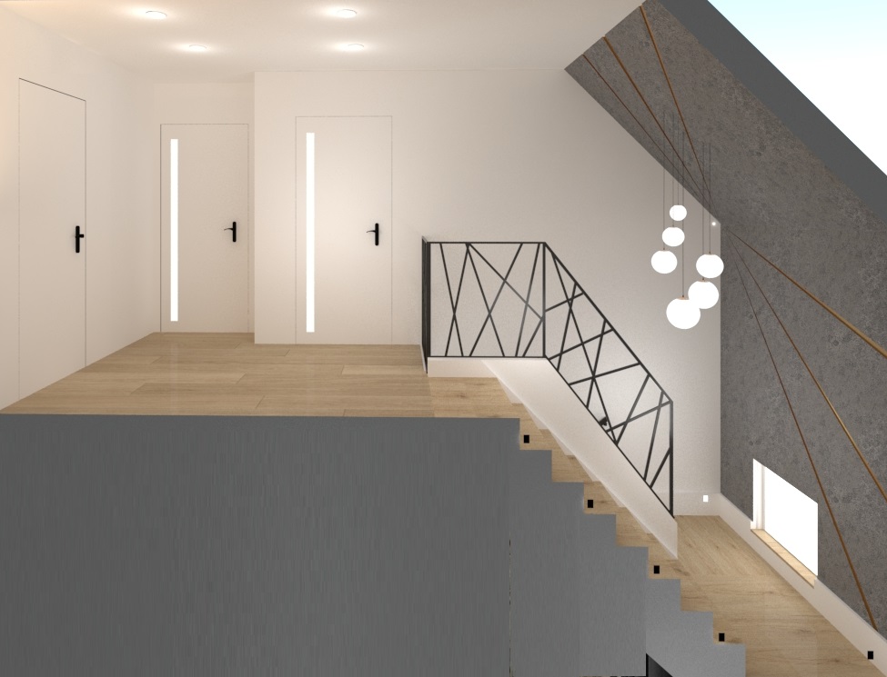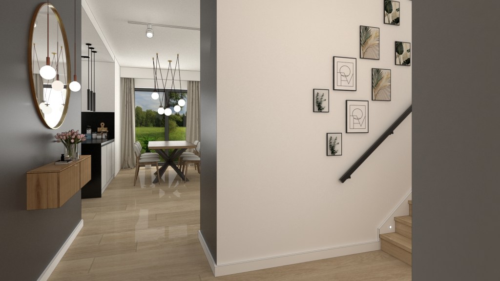 Nowoczesny projekt wnętrza domu w Mrozowie niedaleko Wrocławia. Inwestorzy wyraźnie upodobali sobie styl nowoczesny nie stroniąc od ciepłych akcentów. Aranżacja wnętrza dotyczyła doboru lamp, mebli, kafli oraz podłóg. W ramach współpracy wykonaliśmy tu: projekt kuchni, projekt salonu z kominkiem, projekt dużej i małej łazienki, projekt sypialni oraz klatki schodowej ze schodami.
