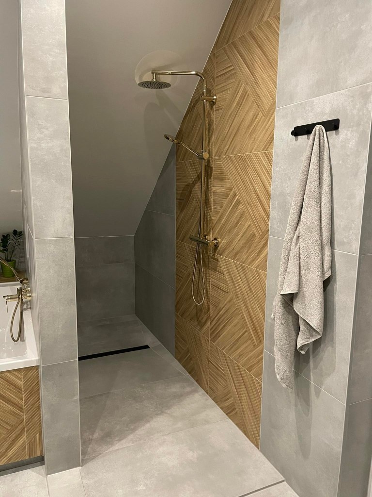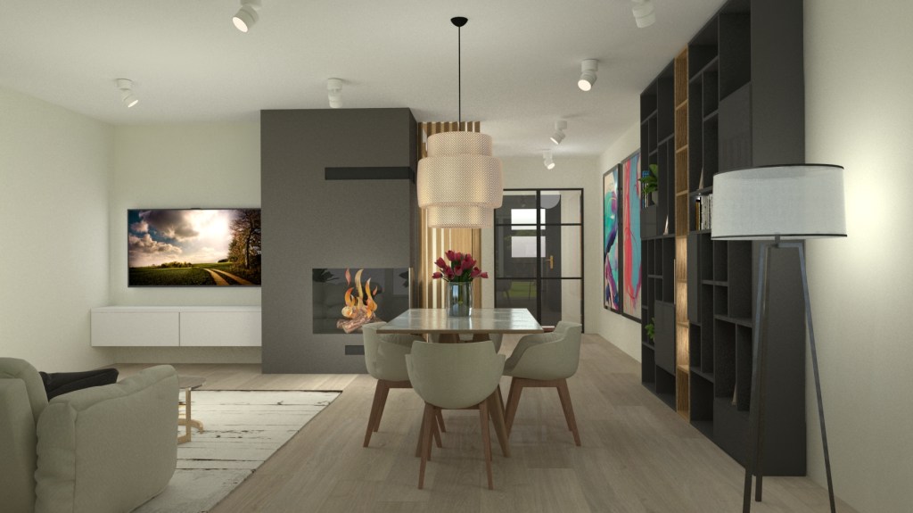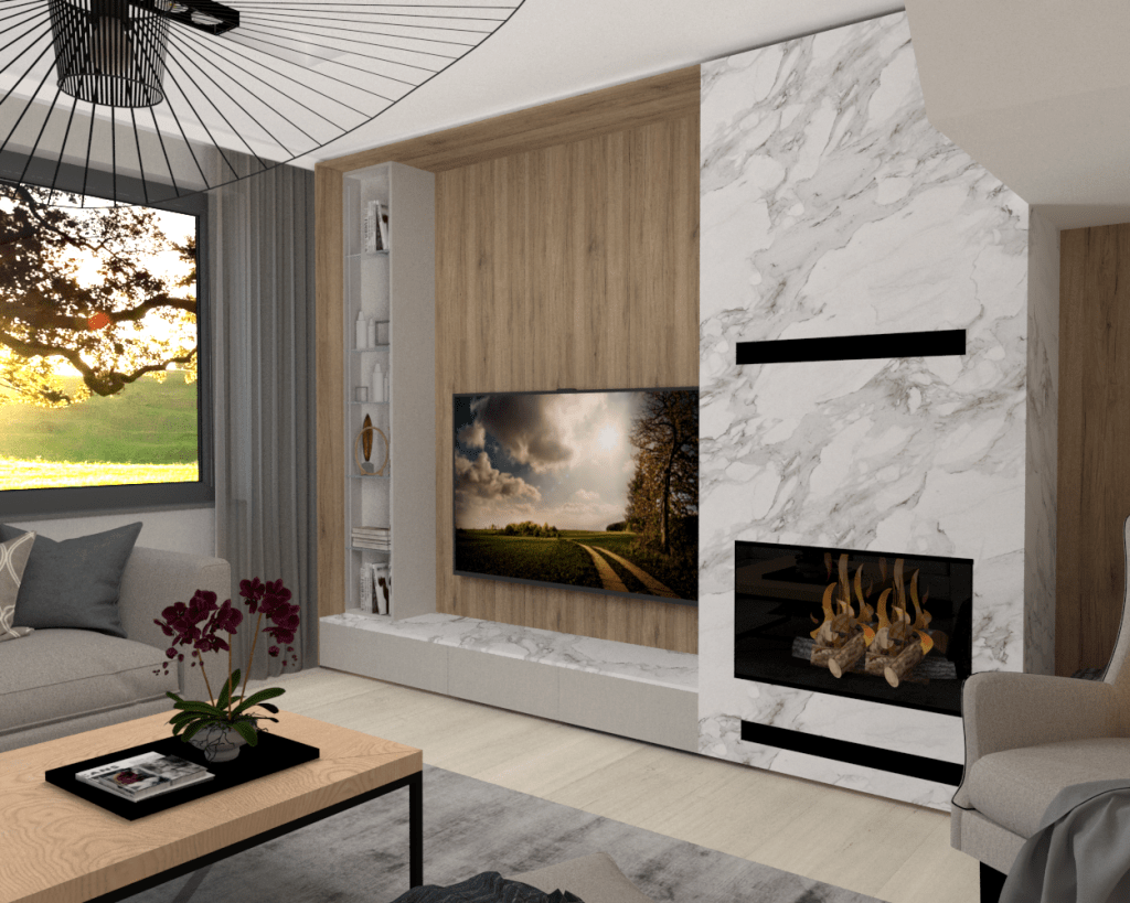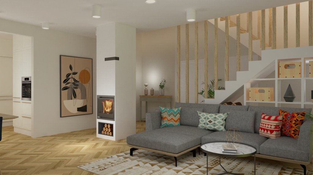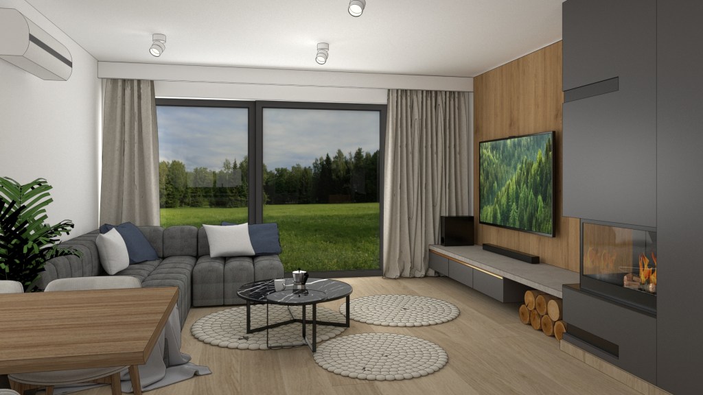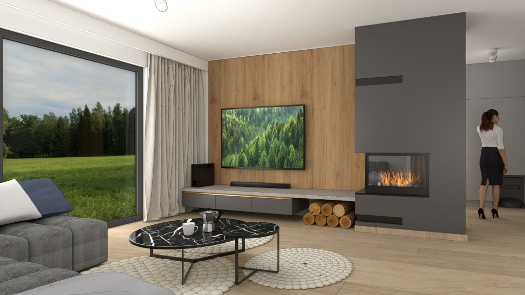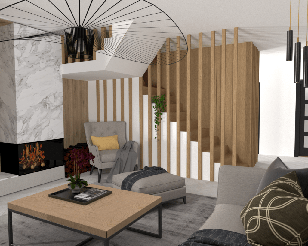 Projekt wnętrza domu w nowoczesnym stylu z otwartą, designerską zabudową przestrzeni TV, prostym minimalistycznym kominkiem i schodami wykończonymi ażurową lamelą. Nowoczesne i proste w utrzymaniu łazienki.