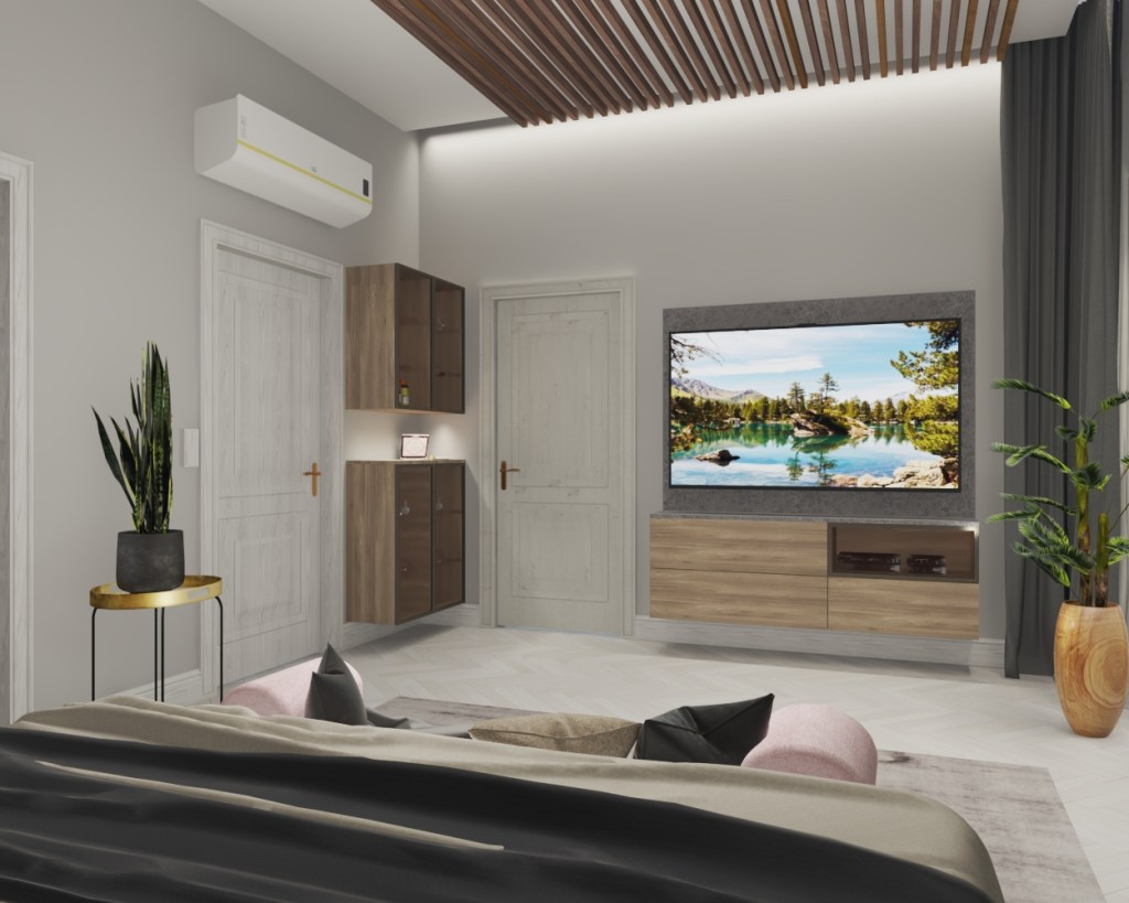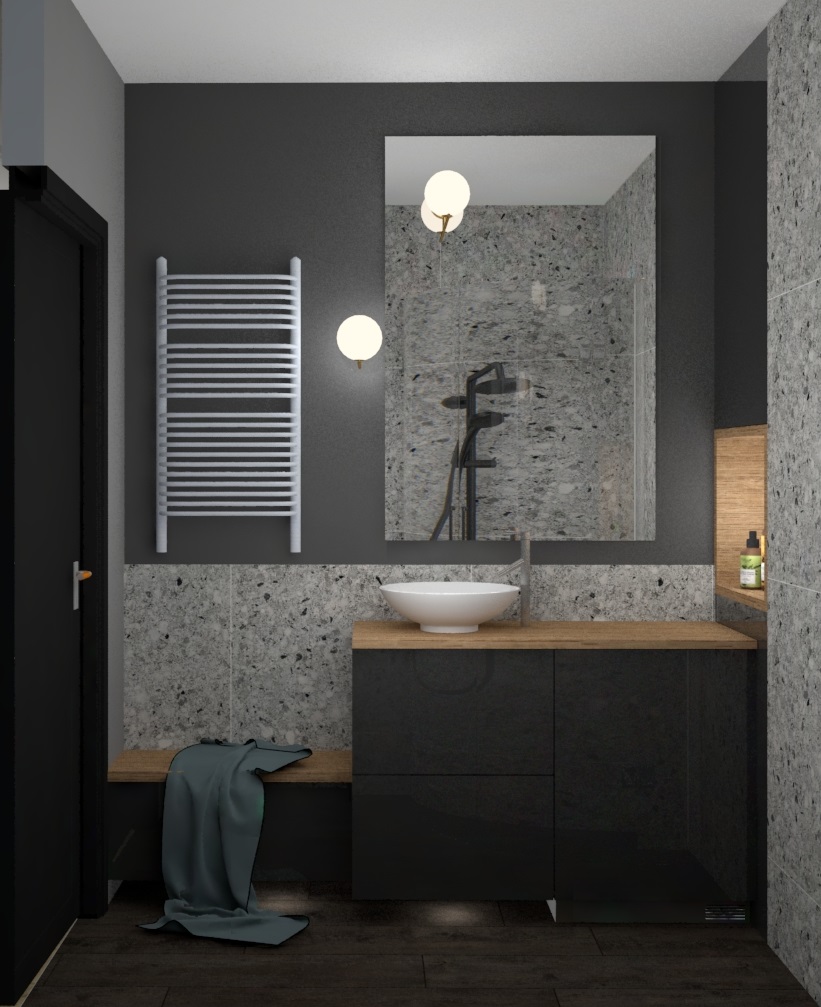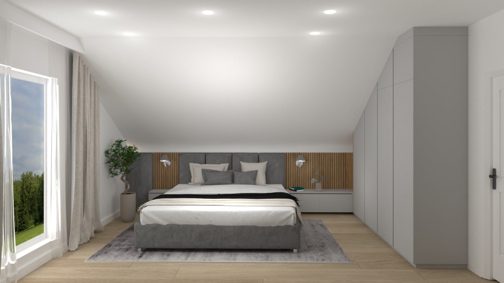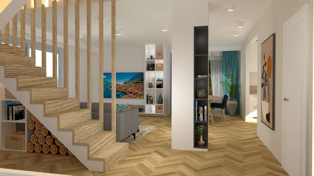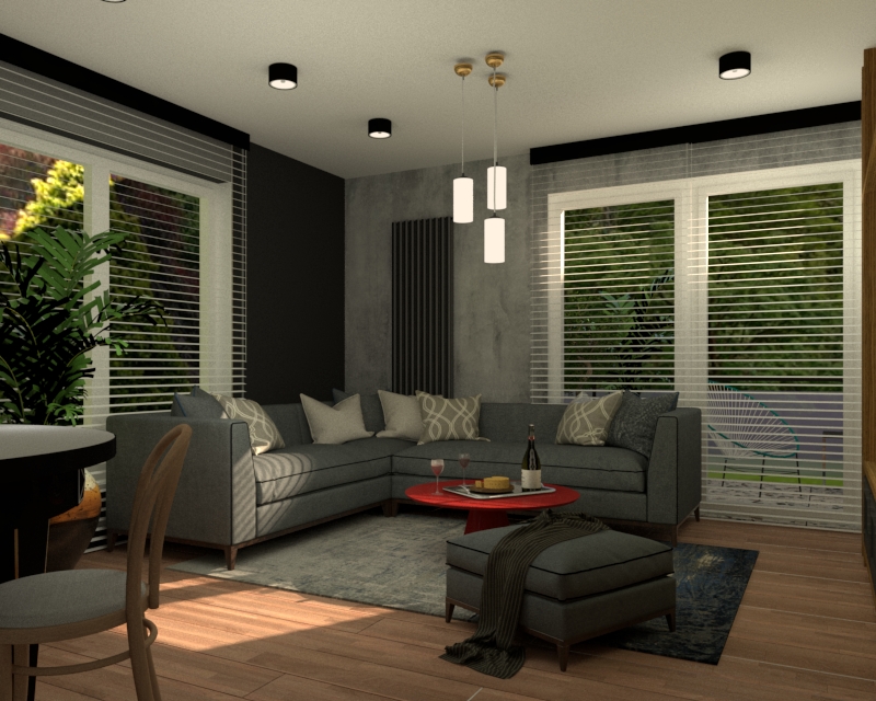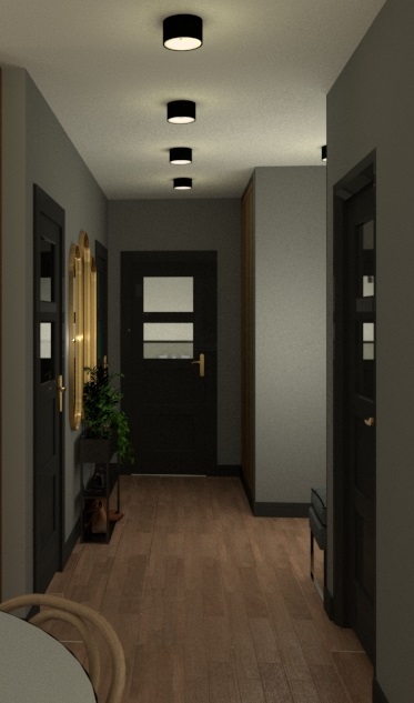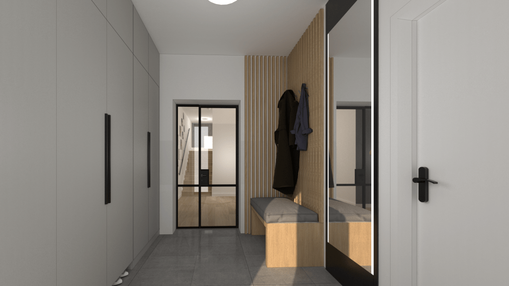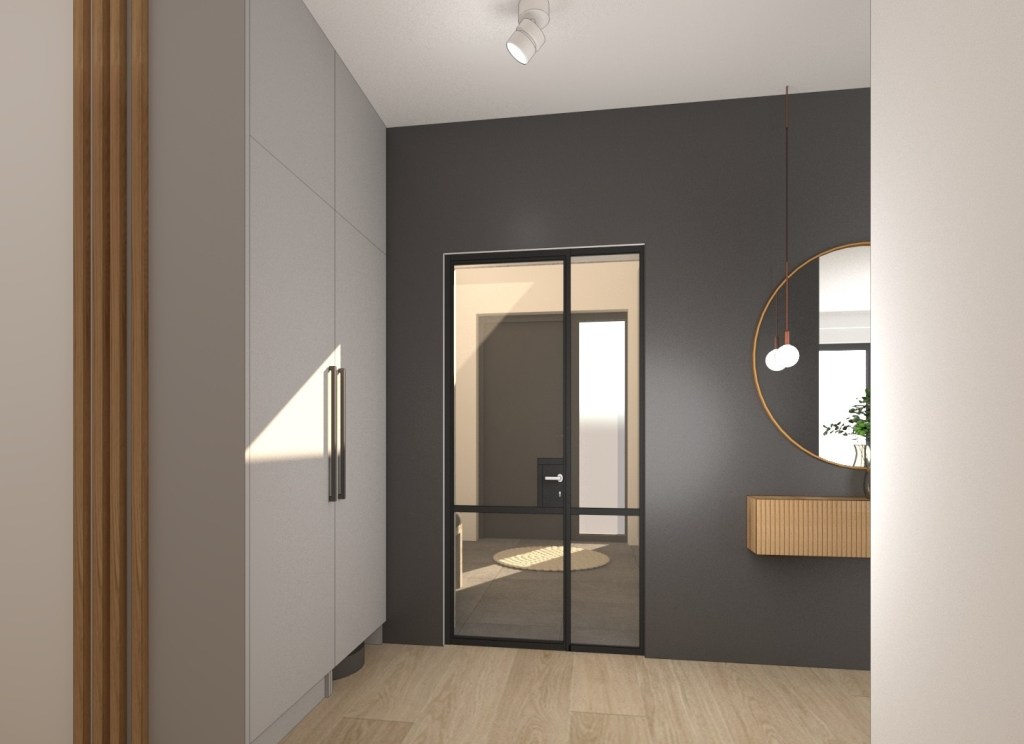 Projekt koncepcyjny nowoczesnego wnętrza przygotowany w oparciu o ulubioną kolorystykę Inwestora. Główne skrzypce w tej aranżacji odgrywają grafit, szarość, biel i drewniane akcenty dodające wnętrzu przytulności i ciepła. Nowoczesna i praktyczna zabudowa meblowa sprawia, że poszczególne pomieszczenia są przestronne i funkcjonalne, a przy tym piękne.